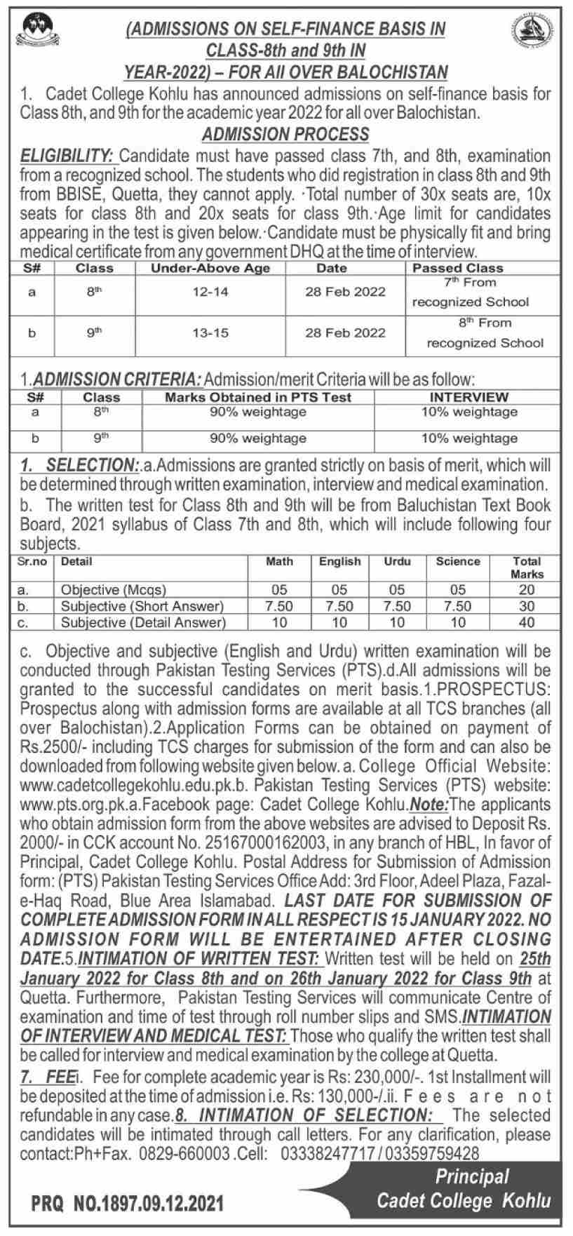 Admission form of Cadet College Kohlu 7th Class(9th Entry) 2024